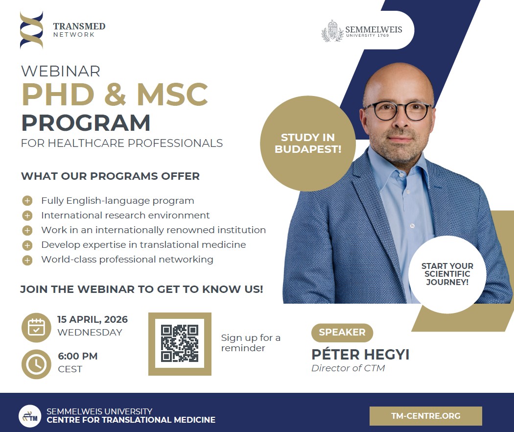 Április 15-én 18 órakor online webinart tart a Semmelweis Egyetem Transzlációs Medicina Központja, ahol bemutatják a Transzlációs Medicina Képzési Programot (TMKP), valamint a klinikai transzlációs medicina mesterképzés program részleteit, és válaszolnak az érdeklődők kérdéseire.